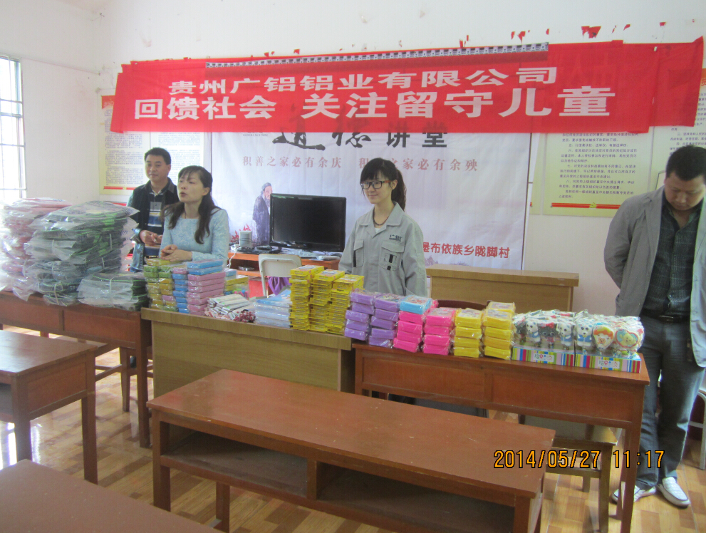 上午9:30時(shí),滿(mǎn)載慰問(wèn)品的車(chē)隊從公司出發(fā),并用半小時(shí)左右的時(shí)間到達目的地——隴腳村。隴腳村位于貴陽(yáng)市東北部烏當區新堡布依族鄉境內,地處山區,經(jīng)濟落后,交通閉塞。在當地村委會(huì )的積極配合下,慰問(wèn)活動(dòng)進(jìn)展井然有序。到達目的地后,我們首先向各位村民簡(jiǎn)要介紹了貴州廣鋁鋁業(yè)有限公司以及此行的目的,隨后為留守兒童逐一派發(fā)了書(shū)包、文具等學(xué)習用品??吹叫∨笥褌兡樕咸煺鏌o(wú)邪的笑容,我們的心中充滿(mǎn)了喜悅和感動(dòng)。