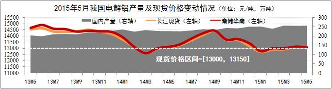 發(fā)稿時(shí)間:2015-06-17市場(chǎng)運行低位偏冷。市場(chǎng)供給方面,5月份我國電解鋁產(chǎn)量為256萬(wàn)噸,環(huán)比基本持平,同比增長(cháng)12%,市場(chǎng)供給穩定?,F貨價(jià)格方面:5月份電解鋁現貨價(jià)格基本擺脫了年初快速下滑的頹勢,目前國產(chǎn)現貨價(jià)格基本穩定在13000元/噸-13150元/噸的區間范圍。從價(jià)格波動(dòng)趨勢上看,5月份電解鋁現貨市場(chǎng)價(jià)格略高于去年同期水平,但尚未出現季節性反彈跡象。