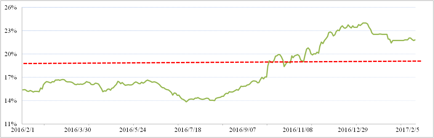 滬鋁三月比例價(jià)方面,2017年1月上期所三月期鋁結算價(jià)加權平均值為13,154.77元/噸,以17.6%作價(jià)2月份氧化鋁長(cháng)單價(jià)為2,315元/噸,較1月份長(cháng)單比例價(jià)上漲6.46元/噸。與現貨加權價(jià)格價(jià)差為654元/噸。1月份全國氧化鋁現貨加權價(jià)與滬鋁三月加權平均價(jià)實(shí)際折算比例為21.82%,較上月有所縮小。