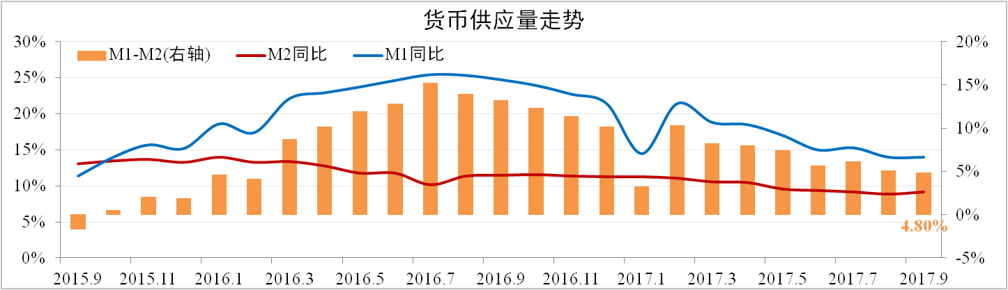 分析認為:受上游盈利轉好以及產(chǎn)能擴張受限影響,企業(yè)部門(mén)融資需求有走弱趨勢。另外“金九”慘淡收場(chǎng),房產(chǎn)調控趨嚴,旺季不旺。綜合來(lái)看,M2回升動(dòng)能不強。預計10月貨幣供應依然偏弱。