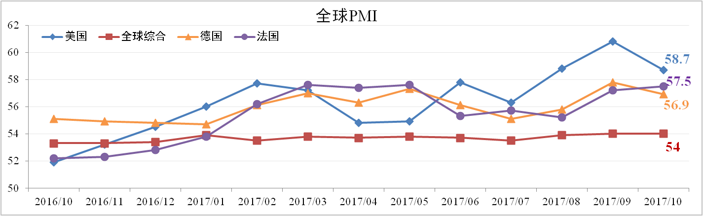 10月全球PMI為54點(diǎn),與上月持平。其中,美國、德國PMI分別下滑2.1、0.9點(diǎn)至58.7、56.9點(diǎn),法國PMI上漲0.3至57.5點(diǎn)。發(fā)達國家有小幅下滑,但整體仍處于較高水平,另外,德國三季度GDP為2.3%大超市場(chǎng)預期。