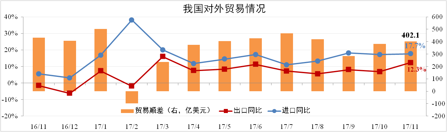 11月我國進(jìn)口量為1771.68億美元,同比上漲17.7%,出口量為2173.82億美元,同比上漲12.3%,二者均大超市場(chǎng)預期。11月貿易順差402.14億美元,同比下降6.92%,環(huán)比上漲5.33%。