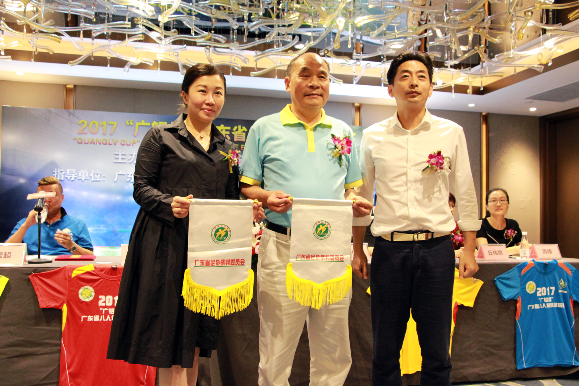 廣鋁公益基金會(huì )理事長(cháng)吳作榮先生與廣東省足球協(xié)會(huì )副秘書(shū)長(cháng)席兵先生、聲色體育董事總經(jīng)理曾巧瑩女士交換禮品
