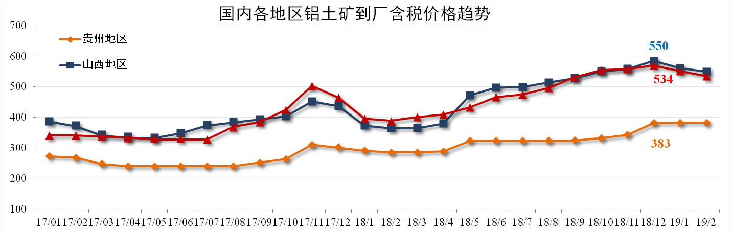 2月份,各地鋁土礦價(jià)格有不同程度的下滑,貴州(AL:60%,A/S:5.5-6)到廠(chǎng)含稅價(jià)月均價(jià)383元/噸,與1月價(jià)格持平;山西鋁土礦550元/噸,環(huán)比下降2.03%;河南鋁土礦534元/噸,環(huán)比下降3.09%。