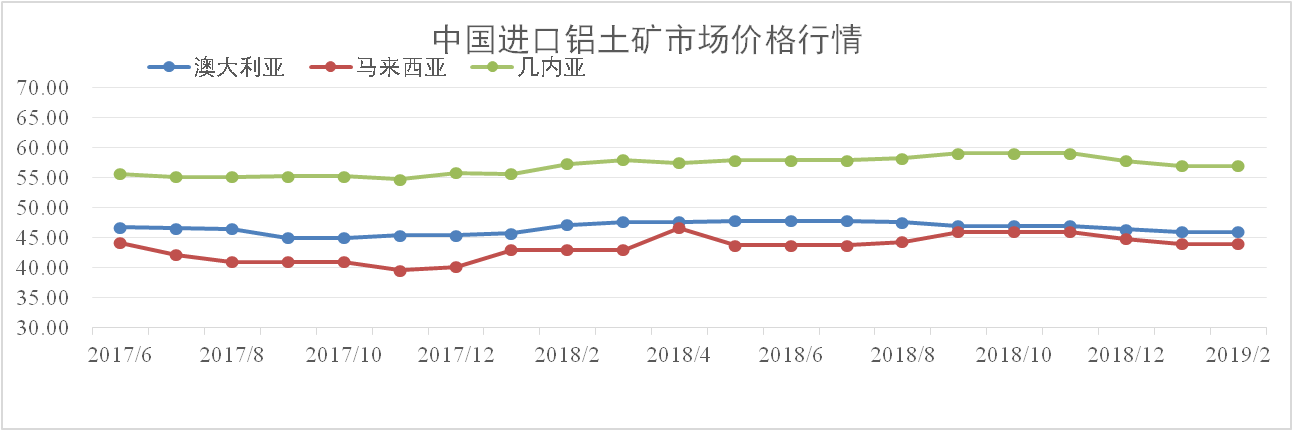 2月份澳大利亞進(jìn)口鋁土礦到岸價(jià)格為46美元/噸,同比下降2.52%,馬來(lái)西亞為44美元/噸,同比上漲4.19%,幾內亞鋁土礦到岸價(jià)格為57美元/噸,同比下降0.57%。