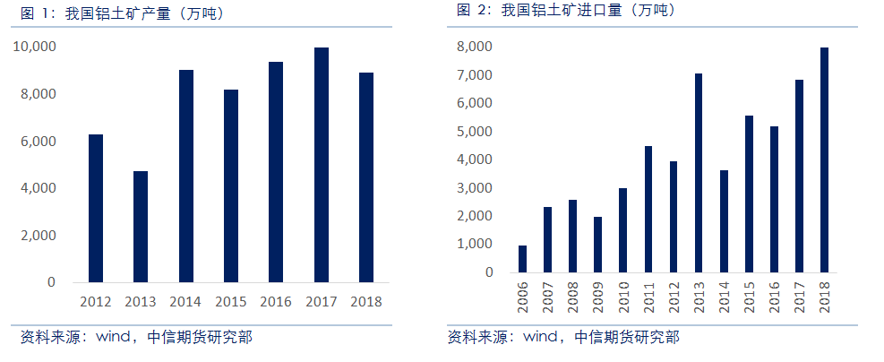 海關(guān)數據顯示,2014年以來(lái),我國鋁土礦進(jìn)口保持穩步增長(cháng)。2018年,我國氧化鋁產(chǎn)量約為7200萬(wàn)噸,鋁土礦產(chǎn)量約1億噸,2018年全國進(jìn)口鋁土礦約占國內礦石總供應量的42%。海外礦石因儲量豐富、開(kāi)采成本低、礦石品位較高等優(yōu)勢逐漸受到國內氧化鋁企業(yè)的青睞,另外,隨著(zhù)山西地區資源過(guò)度開(kāi)采,鋁土礦品位下降,山西政府有保護省內資源的意愿,預計該地區礦石開(kāi)采將繼續受到限制,進(jìn)口礦使用將逐漸成為主流。